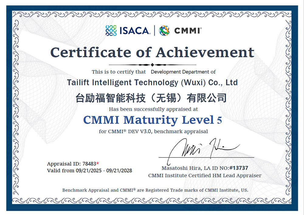 台勵福智能科技(無錫)有限公司軟體開發部門正式通過 CMMI DEV V3.0 Maturity Level 5 認證。這代表我們在軟體研發、流程管理與品質優化上達到 國際最高等級,可為全球客戶提供更 高效、可靠、創新的智慧物流與智能製造解決方案。
